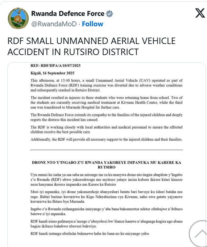 The Rwanda Defence Force (RDF) has expressed regret after a small unmanned drone crashed in Rutsiro District, injuring three schoolchildren who were on their way home.