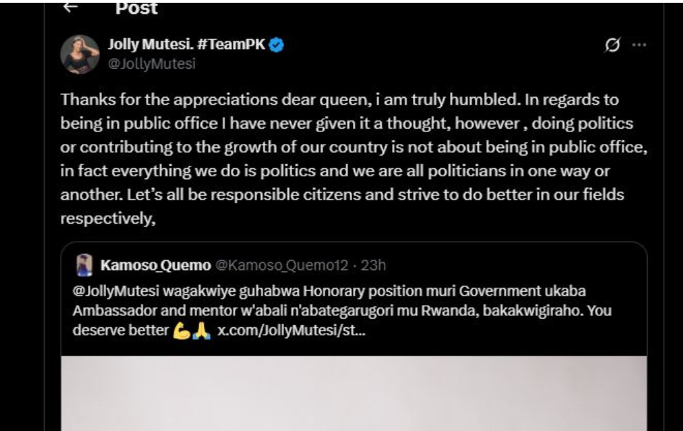 Her comments followed a suggestion by social media user Kamoso Quemo, who publicly called for her appointment as an ambassador and advisor for youth and women in Rwanda. “Jolly Mutesi deserves an honorable place in government as an ambassador and advisor to women in Rwanda, where many can learn from her. She deserves more,” Quemo wrote.