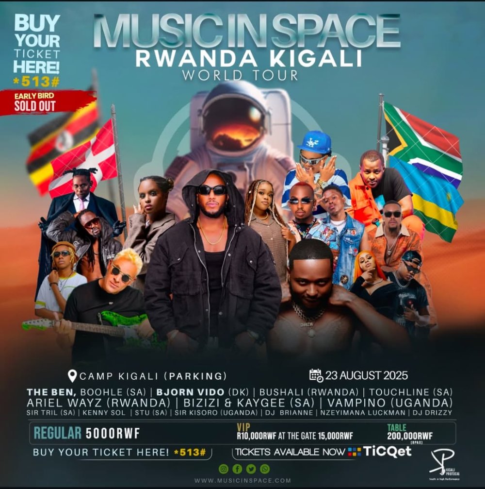 The Music in Space lineup promised an exciting mix of performers, including Rwandan stars The Ben, Bushali, Ariel Wayz, and Kenny Sol, alongside South Africa’s Boohle, Touchline Truth, Bizizi & Kaygee D’A King, and STU. Ugandan artists Vampino and Sir Kisoro were also scheduled to share the stage in Kigali, joined by DJs Phil Peter and Brianne, with MC Lucky as host.