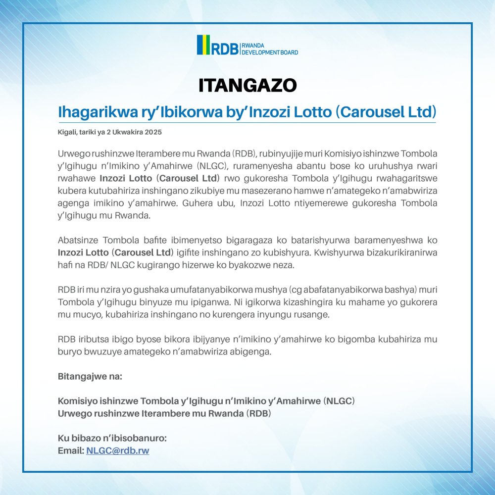 The Rwanda Development Board (RDB), through the National Lottery and Gaming Commission (NLGC), has announced the suspension of Inzozi Lotto’s (Carousel Ltd) license to operate the National Lottery, citing violations of contractual obligations, regulations, and laws governing games of chance.