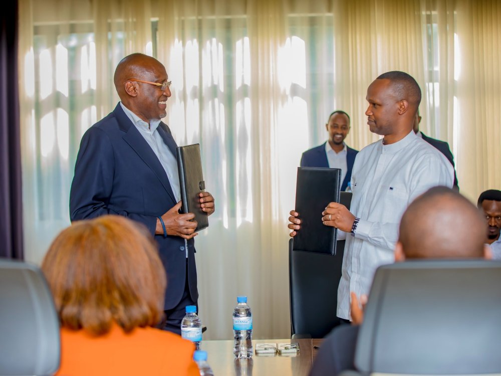 FERWAFA President, Shema Ngoga Fabrice (left), and Rwanda Premier League Chairman, Mudaheranwa Hadji Yussuf (right), after unveiling the regulations that will govern the 2025/26 season in September.